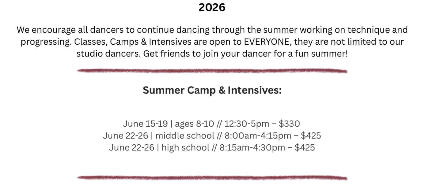 intensives including Milwaukee Ballet, Kanopy Dance, Des Moines Ballet, Point Park